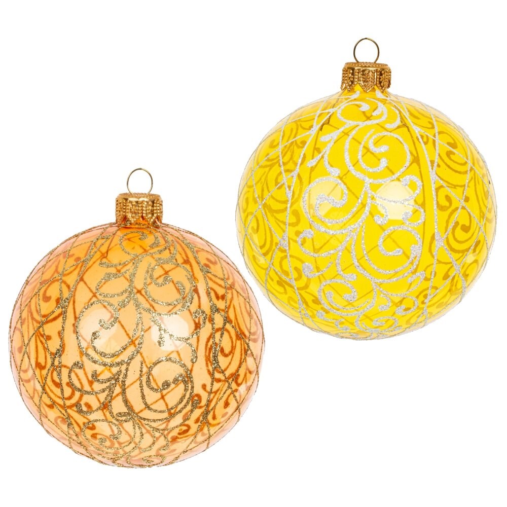 Стеклянный шар выполнен в традиционном праздничном стиле. Глянцевая поверхность и изящные узоры придают этому шару особую изысканность.