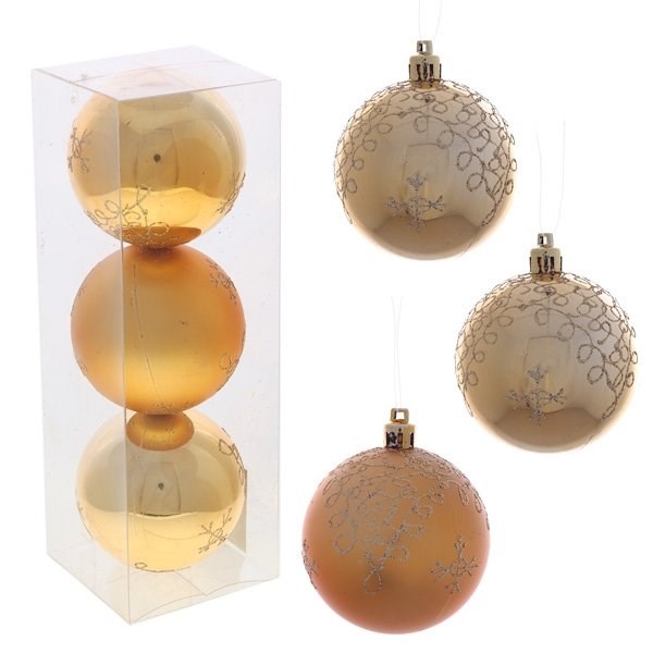 Набор из 3-х новогодних украшений (золотые елочные шары с серебристым изящным узором) изготовлен из полимерных материалов, в подарочной упаковке