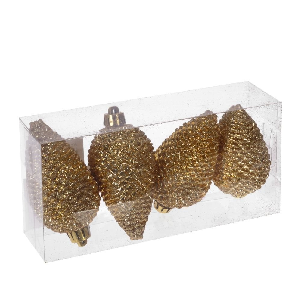 Шабор из 4-х шишек размером 4,5*4,5*8 см золотистого цвета глиттером.Шишки изготовлены из пластика.Упакован в прозрачную пластиковую коробку размером 8,5*4,5*17 см