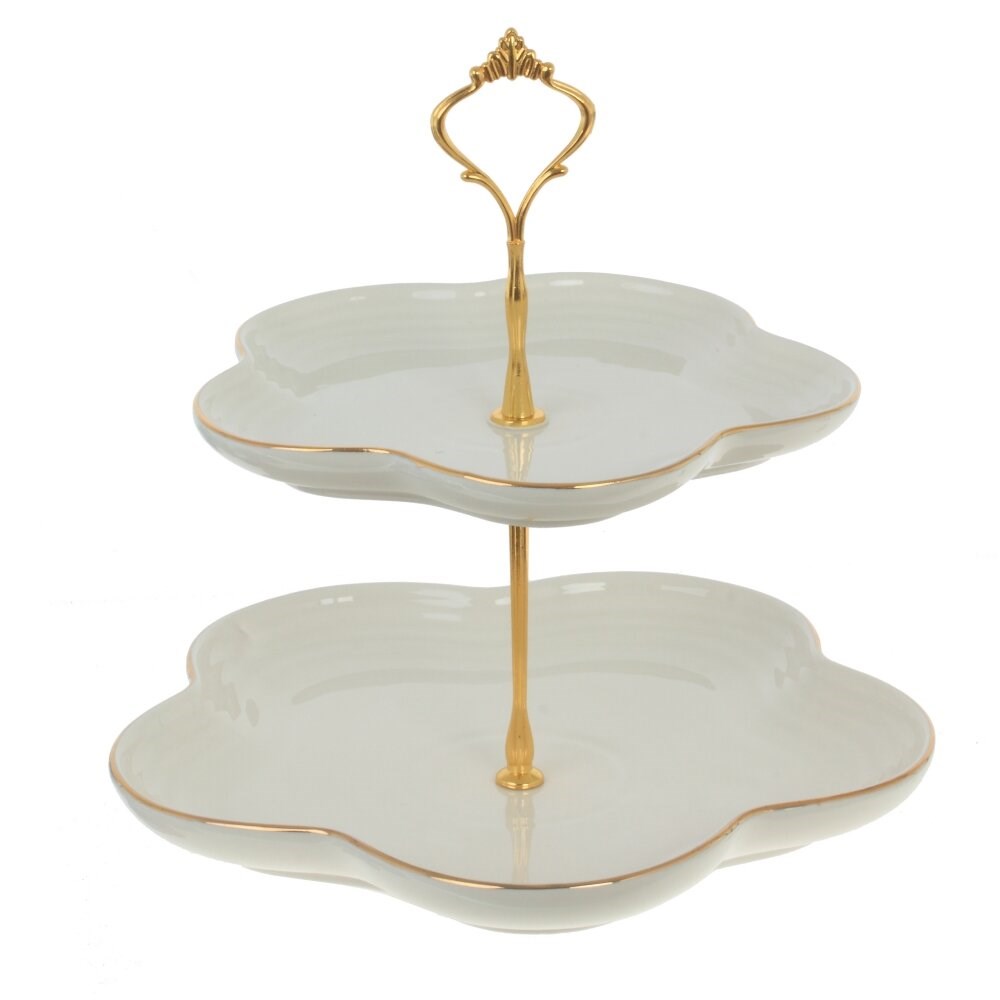 Приподнесите для своих гостей пирожные или фрукты на этой изящной и привлекательной вазе. Две фарфоровые тарелочки, расположенные одна над другой, позволяют создать настоящую композицию из любимых угощений. Такая подставка может стать центральным элементом вашего праздничного стола.