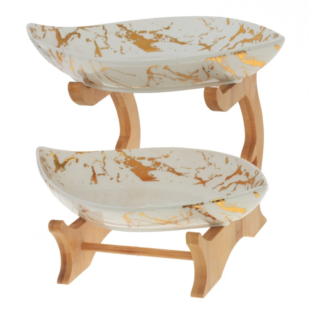 Приподнесите для своих гостей пирожные или фрукты на этой изящной и привлекательной вазе. Две фарфоровые тарелочки, расположенные одна над другой, на деревянной подставке позволяют создать настоящую композицию из любимых угощений. Такая подставка может стать центральным элементом вашего праздничного стола.