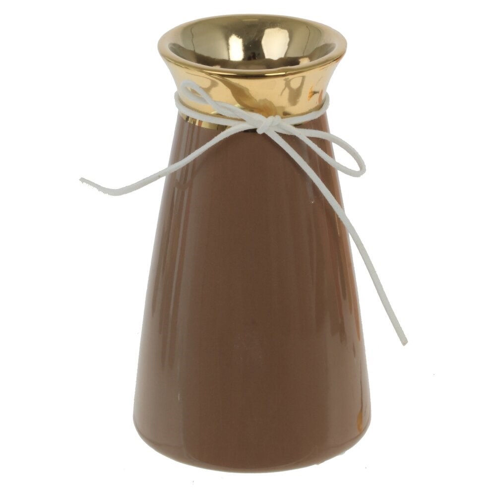 Декоративная керамическая ваза для цветов. Оригинальная форма шоколадного цвета с золотым горлышком и декоративным шнурком. Диаметр горлышка: 5 см.