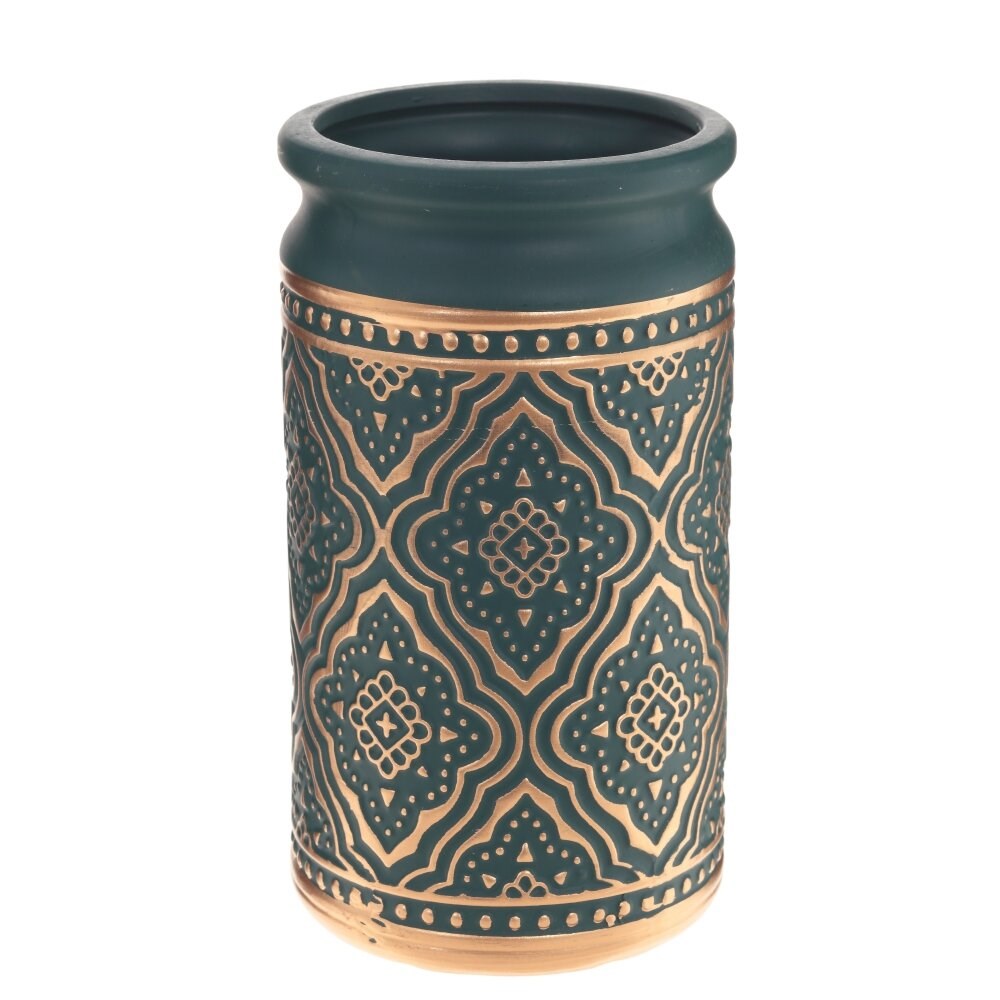Великолепная декоративная ваза с необычным золотым узором выполнена из керамики. Такая ваза непременно обратит на себя внимание и станет изюминкой любого интерьера. Диаметр горлышка 10 см.