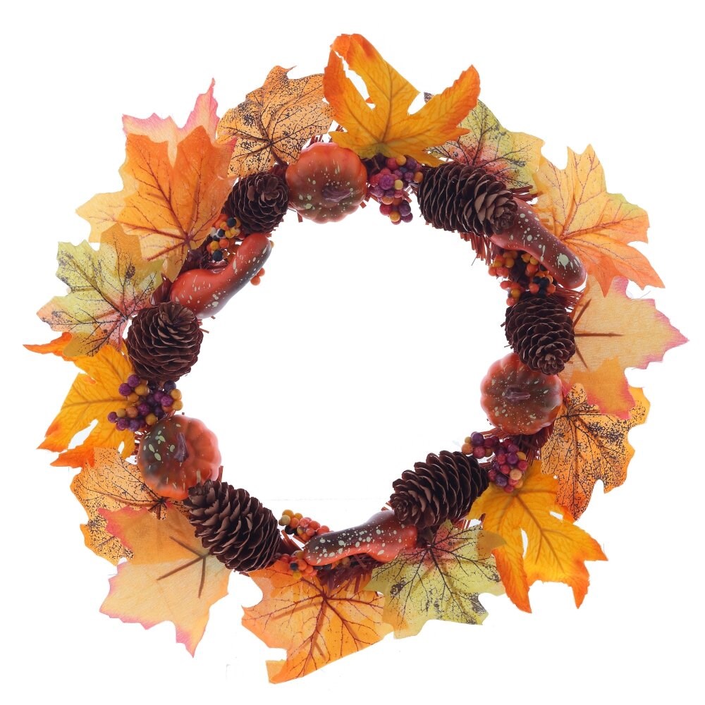 Колоритный, теплый, уютный осенний венок. Подарит массу приятных эмоций, придаст вашему интерьеру индивидуальность, станет отличным подарком друзьям и близким.В основе веточки, декорирован шишками, искусственными тыковками и листьями ярких осенних цветов.