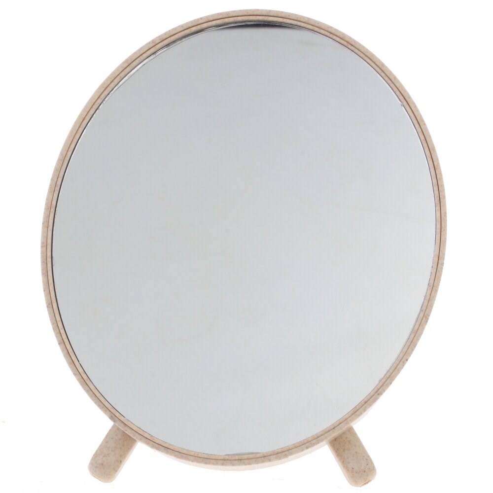 Небольшое настольное зеркало в пластиковой оправе с карманом для мелочей на задней стенке.. Подходит для нанесения макияжа, бритья и проведения любых косметических процедур.