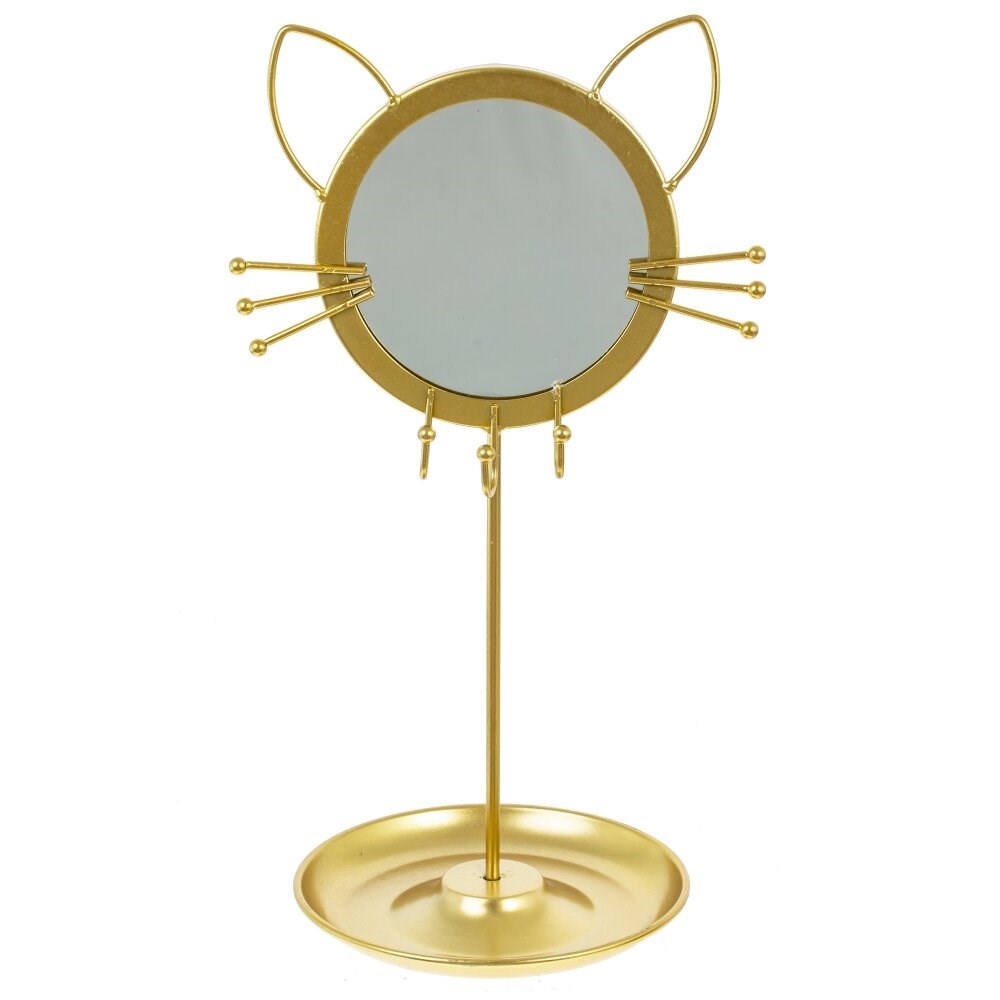 Небольшое настольное зеркало подходит для нанесения макияжа и проведения любых косметических процедур. Оно заключено в металлическую оправу, с удобным основанием, на котором имеются крючки-держатели для украшений. Такое зеркальце станет стильным дополнением любого интерьера. Диаметр зеркальной части: 10 см.