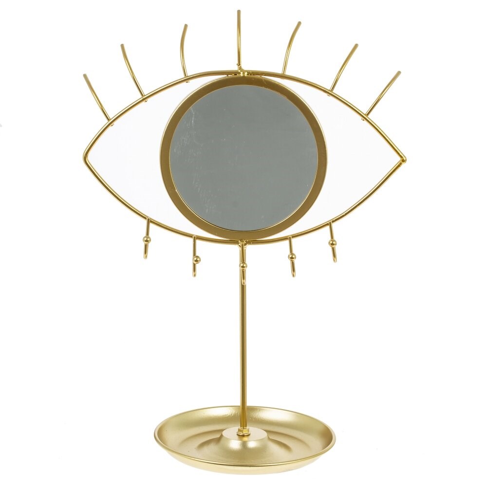 Небольшое настольное зеркало подходит для нанесения макияжа и проведения любых косметических процедур. Оно заключено в металлическую оправу, выполненную в виде глаза, с удобным основанием, на котором имеются крючки-держатели для украшений. Такое зеркальце станет стильным дополнением любого интерьера. Диаметр зеркальной части: 11 см.